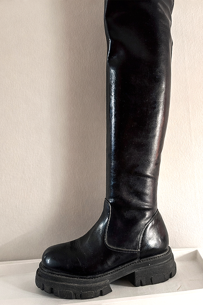 I’ve always loved high boots, not high in terms of heels, but high up the leg. They hide the baggy knee wrinkles, they’re comfortable, and they go with just about anything. I’ve always been a sucker for black leather. And I love the clunky look too; those boots have personality while still being relatively flat. They make me feel grounded, confident, and like I can walk anywhere downtown without needing to “just sit for a minute.”